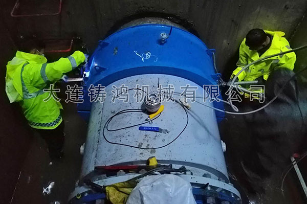 本溪泓源供水有限公司DN1000管道法蘭處泄露,泄漏的管道在管道井里面,泄漏的兩端管徑大小不一,一端是1020mm.另外一端1010mm,管道為鋼管,管道壓力4-5公斤,修補(bǔ)起來較為棘手,鑄鴻機(jī)械根據(jù)現(xiàn)場工況特殊定制修補(bǔ)器,在管道1010一端纏繞膠板進(jìn)行特殊處理后再安裝,在不停水、不停壓的情況下施工。安裝后沒有出現(xiàn)滴漏現(xiàn)象。