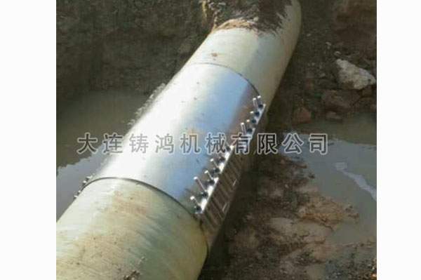 江西萬安縣,工程隊(duì)在施工時(shí)將一個(gè)外徑為624mm的地埋玻璃鋼管挖破,漏點(diǎn)較小沒有察覺,過了幾天施工時(shí),再次挖破同一條管道,這次出現(xiàn)較為明顯的漏水現(xiàn)象,挖開后發(fā)現(xiàn),此管道上有兩處漏點(diǎn),使用備貨庫存兩套萬能片無限延長(zhǎng)修補(bǔ)器進(jìn)行修補(bǔ)。1個(gè)小時(shí)后順利完成修復(fù)。